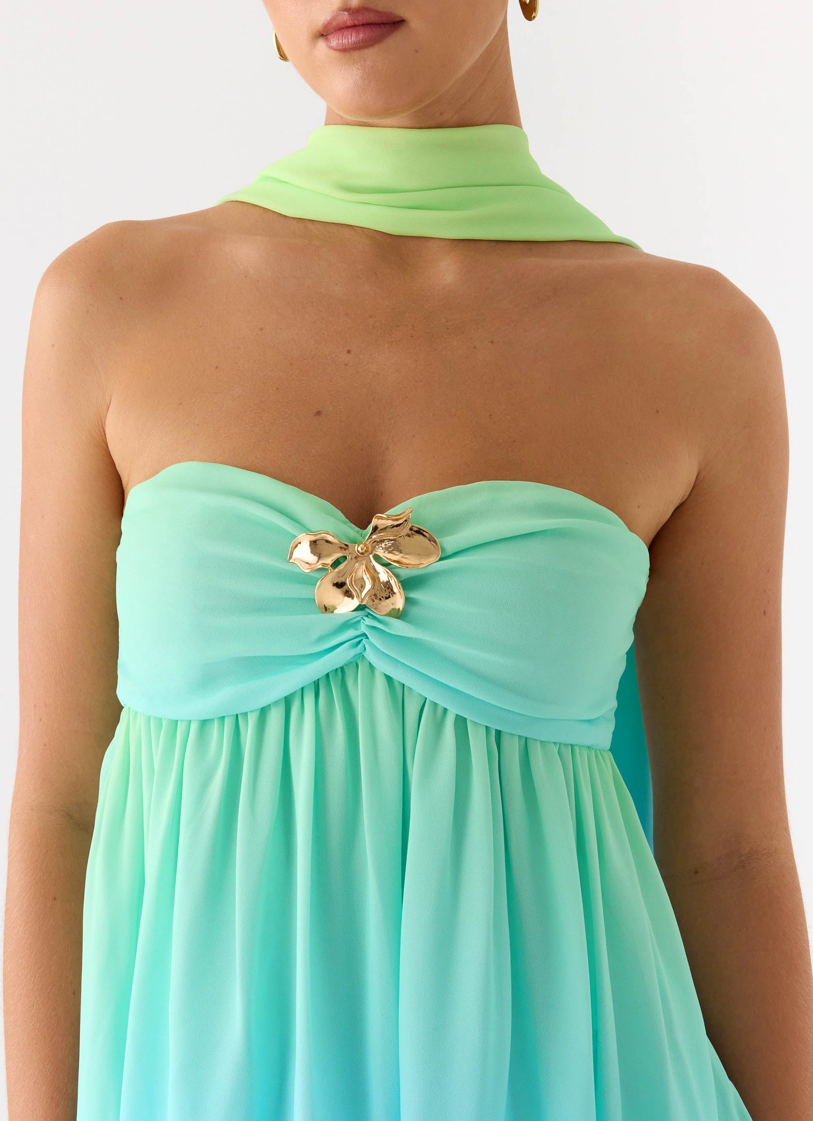 The Calantha Scarf Mini Dress is made for golden hour moments and nights that sparkle under city lights. Featuring a twist sweetheart neckline, flowy silhouette, and scarf detailing, this mini-length style is playful yet polished. Fully lined and finished with a side invisible zipper, it moves effortlessly from sunset to after-dark occasions.