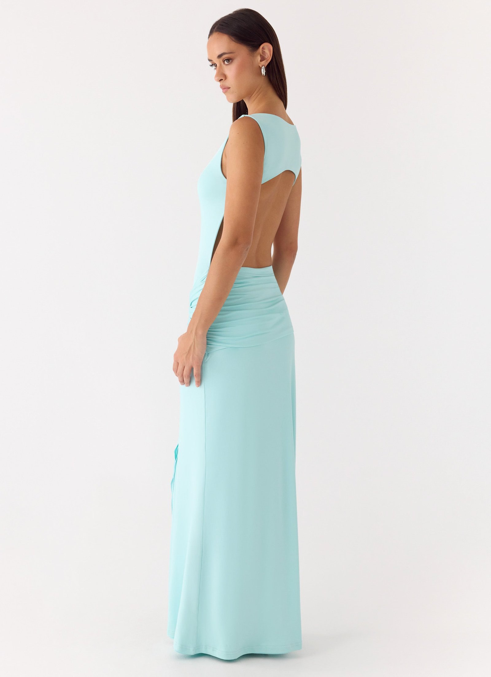 The Fault Line Maxi Dress is a chic, bodycon maxi featuring a boat neckline and back cut-out for subtle allure. With a front tie sash and fully lined stretch jersey fabric, it balances elegance and comfort effortlessly.